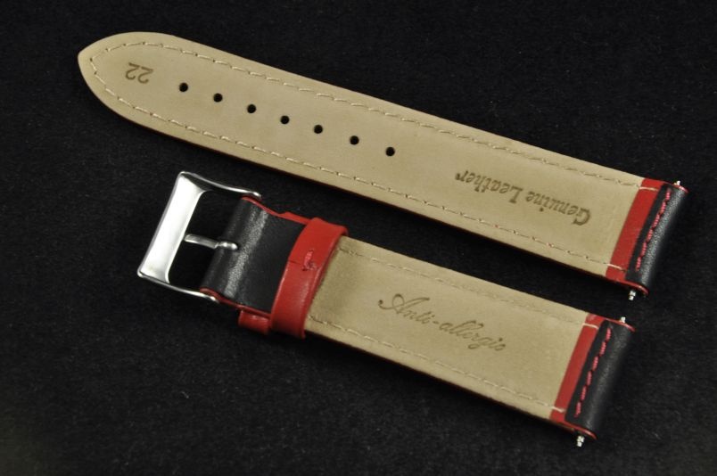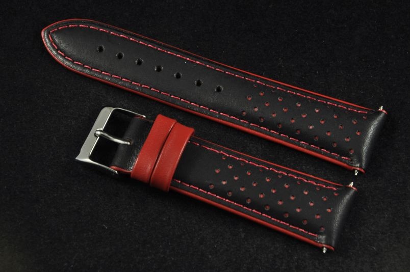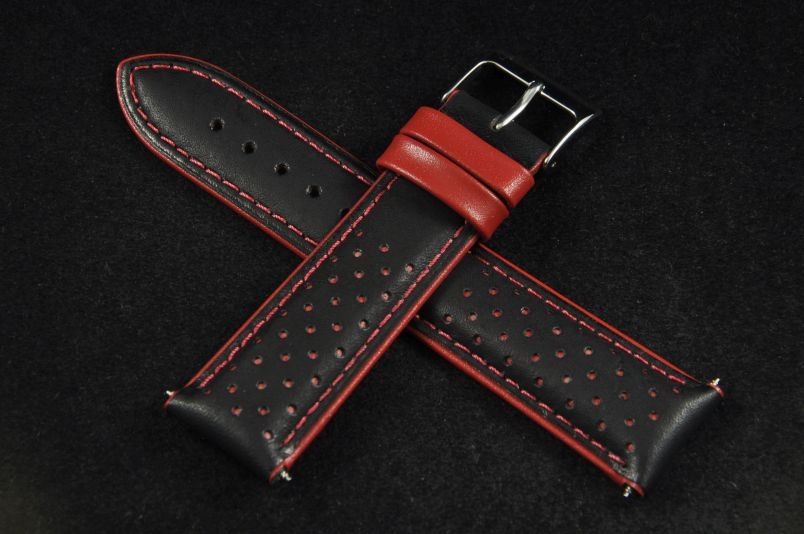 Skórzany pasek wykonany ze skóry typu nubuk. Perforowany wierzch z widoczną kolejną, kolorową warstwą skóry. Mocno pogrubiany do 5,5mm, przy zapięciu pocieniany do 3,6mm. Przyszyty nicią w kolorze czerwonym, brzegi i szlufki w kolorze nici. Podwójna szlufka, stalowa klamerka. Pasek nadający sportowego charakteru.
