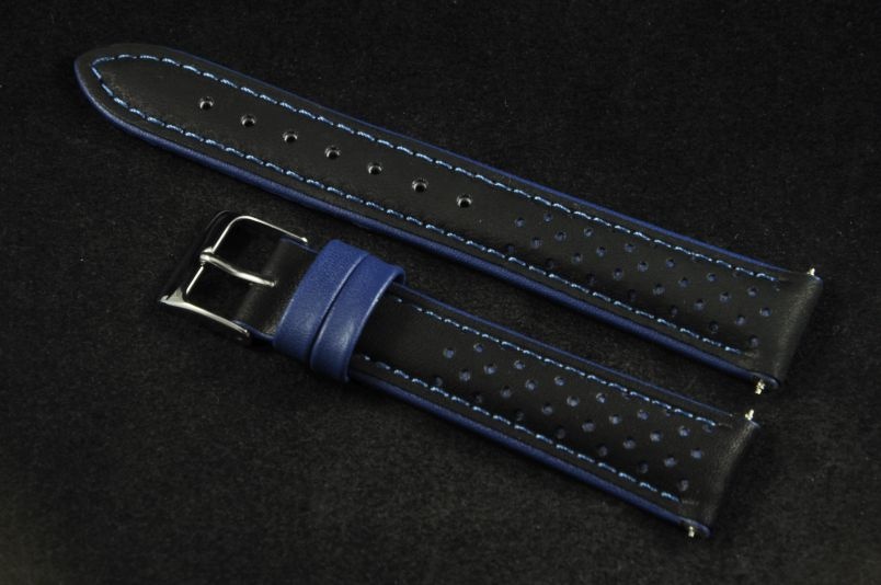 Skórzany pasek wykonany ze skóry typu nubuk. Perforowany wierzch z widoczną kolejną, kolorową warstwą skóry. Mocno pogrubiany do 5mm, przy zapięciu pocieniany do 3,6mm. Przyszyty nicią w kolorze niebieskim, brzegi i szlufki w kolorze nici. Podwójna szlufka, stalowa klamerka. Pasek nadający sportowego charakteru.