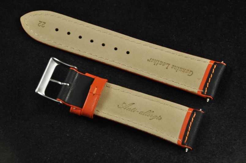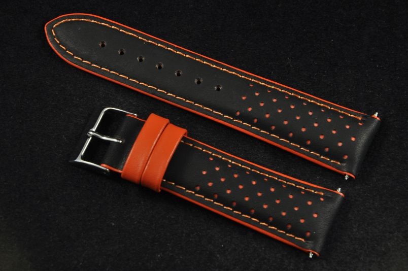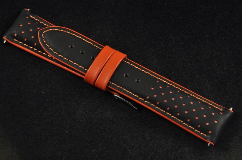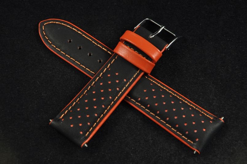 Skórzany pasek wykonany ze skóry typu nubuk. Perforowany wierzch z widoczną kolejną, kolorową warstwą skóry. Mocno pogrubiany do 5,5mm, przy zapięciu pocieniany do 3,6mm. Przyszyty nicią w kolorze pomarańczowym, brzegi i szlufki w kolorze nici. Podwójna szlufka, stalowa klamerka. Pasek nadający sportowego charakteru.