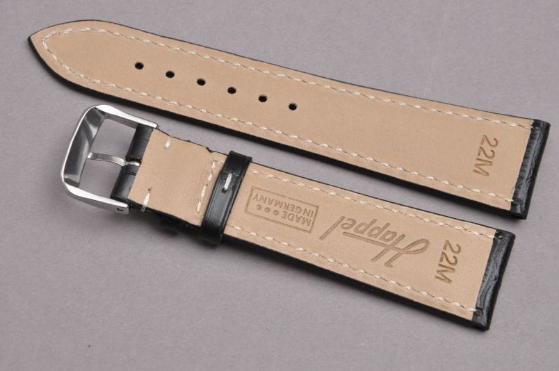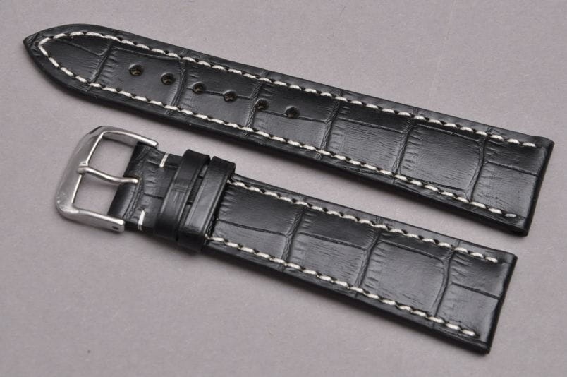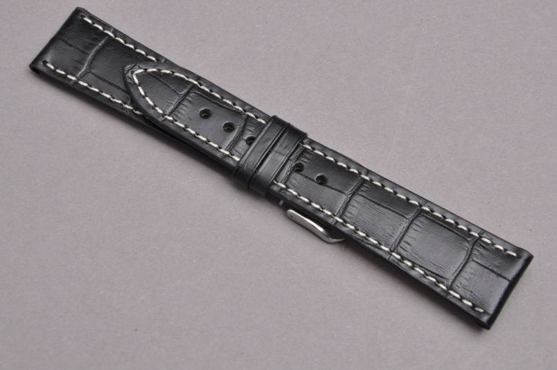 Pasuje do każdego zegarka z teleskopem 22mm. Wykonany z naturalnej skóry, imitacja skóry aligatora. Przeszyty białą nicią. Lekko pogrubiany. Podwójna szlufka. Stalowa klamerka.