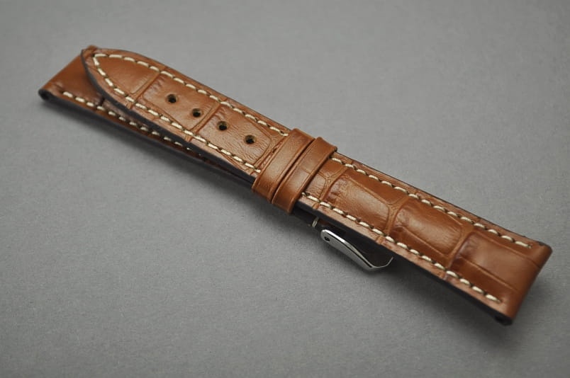 Pasuje do każdego zegarka z teleskopem 19mm. Wykonany z naturalnej skóry, imitacja skóry aligatora. Przeszyty białą nicią. Mocno pogrubiany. Podwójna szlufka. Stalowa klamerka.