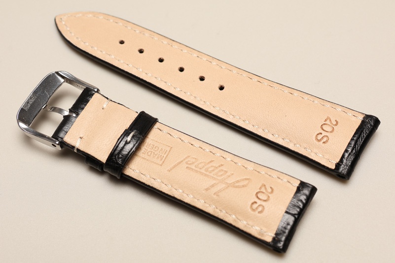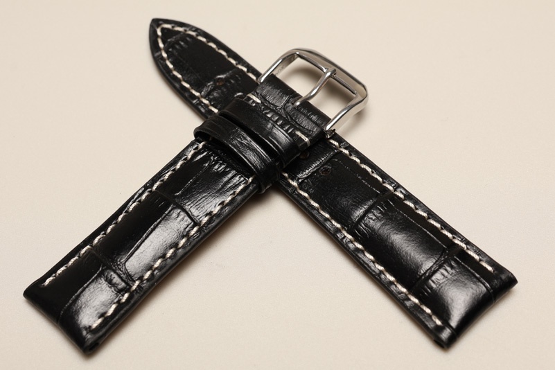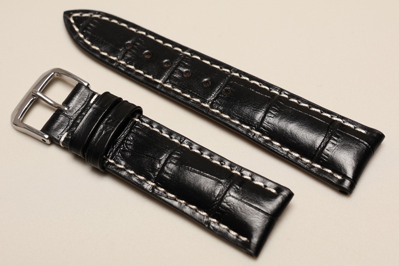 Pasuje do każdego zegarka z teleskopem 22mm. Wykonany z naturalnej skóry, imitacja skóry aligatora. Przeszyty białą nicią. Mocno pogrubiany. Podwójna szlufka. Stalowa klamerka. Krótka wersja S.