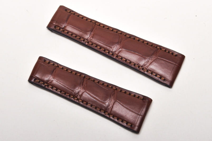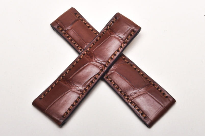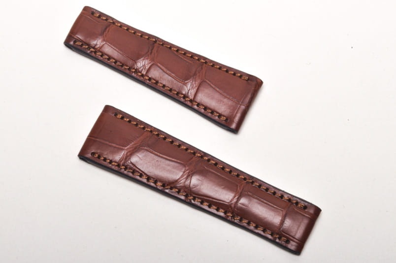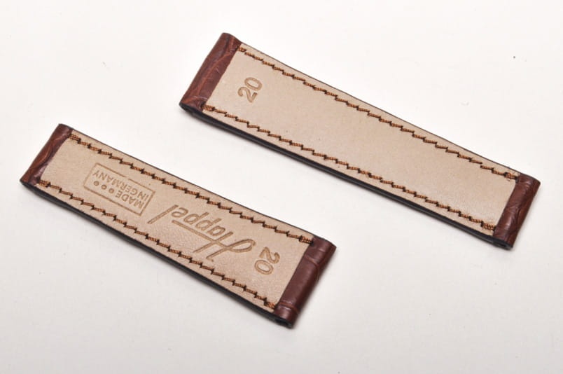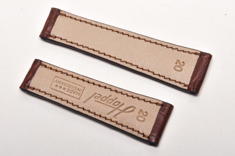 Pasek niemieckiej firmy Happel. Pasuje do zegarków z mocowaniem 20mm oraz oryginalnym zamkiem typu bransoletowego o szerokości mocowania 16mm, np. do zegarka Rolex Daytona. Wykonany z oryginalnej skóry aligatora. Szlachetny, równoległy układ łusek. Pasek w kolorze brązowym, przeszyty nicią pod kolor paska. Pogrubiany od strony zegarka do 4mm, dalej pocieniany do 2,5mm. Brak dziurek, pasek z obu stron posiada mocowanie na teleskop.