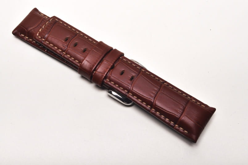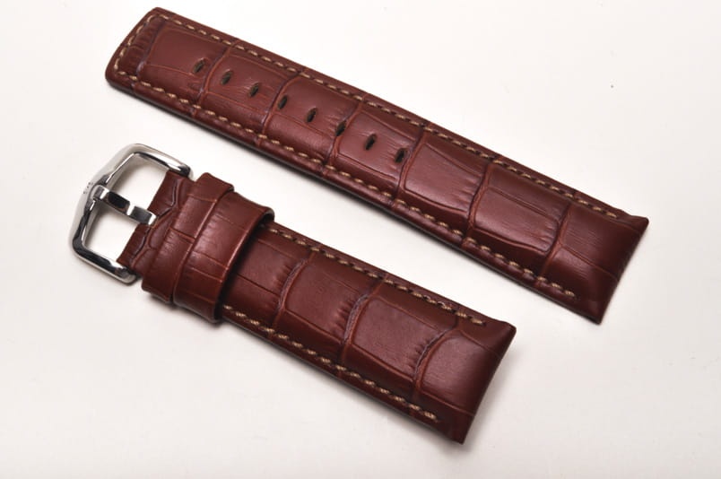 Wodoodporny pasek o sportowym charakterze. Wykonany ze skóry naturalnej tłoczonej na wzór skóry aligatora. Futrówka z gładkiej, czarnej skóry. Przeszywany grubą, lekko kontrastową nicią. Pogrubiany przy mocowaniu do 5,2mm, dalej pasek cieniowany do 4mm. Podwójna szlufka, stalowa klamerka.