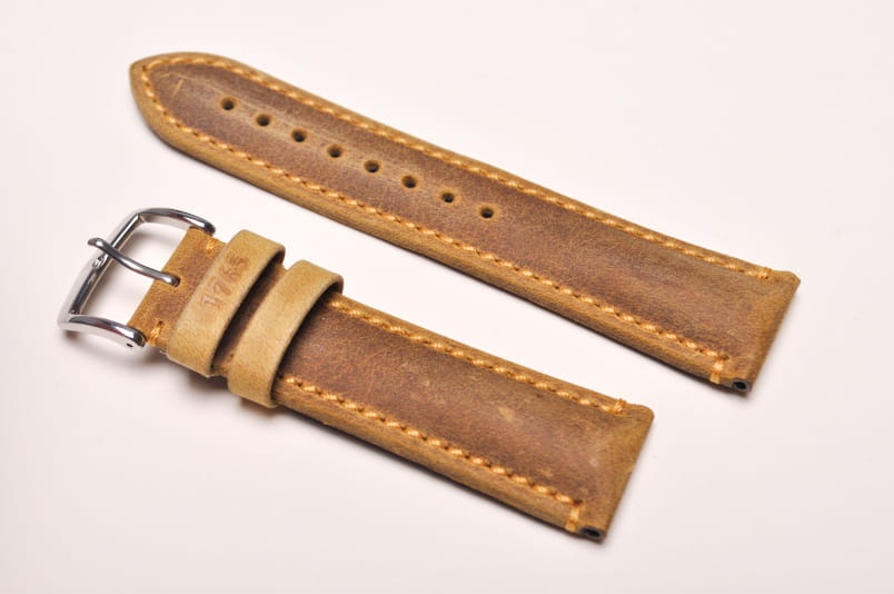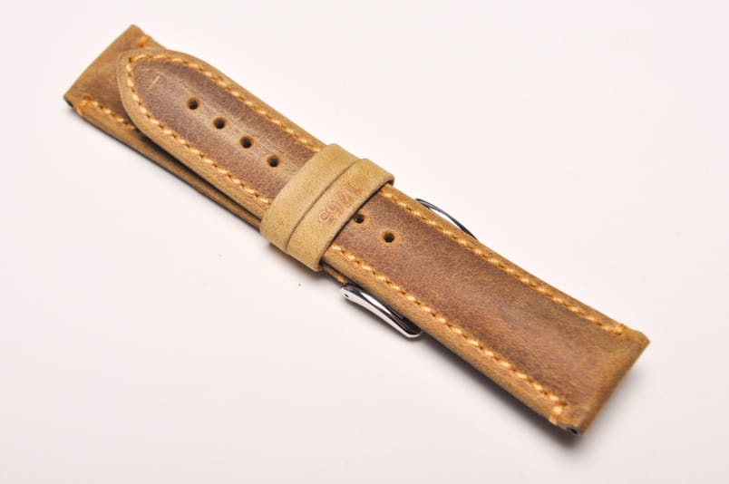 Do zegarków z mocowaniem 22mm. Wykonany z selekcjonowanej skóry typu nubuk, garbowanej roślinnie. Pogrubiony do 8mm. Przeszyty nicią pod kolor paska, Licowa futrówka w ciemnym kolorze. Podwójna szlufka, stalowa klasyczna klamerka.