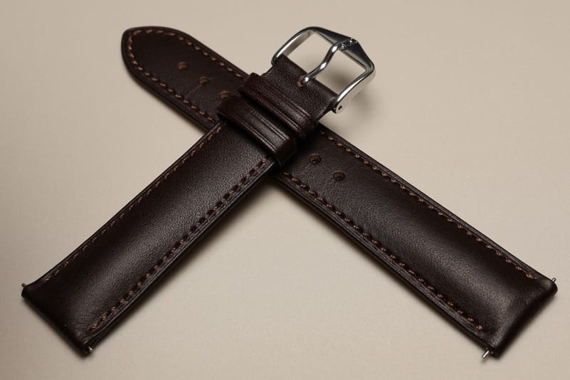 Wykonany z naturalnej skóry cielęcej. Futrówka typu Softglove - miękka i miła w dotyku. Przeszywany delikatną nicią ton w ton. Pogrubiany przy mocowaniu do 5mm, dalej pasek cieniowany do 2,6mm. Podwójna szlufka, metalowa klamerka. Wbudowane teleskopy do szybkiej zmiany.