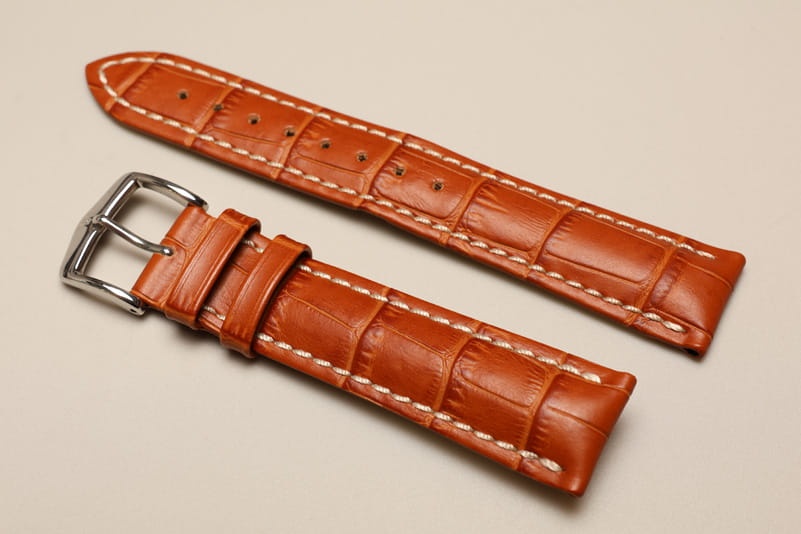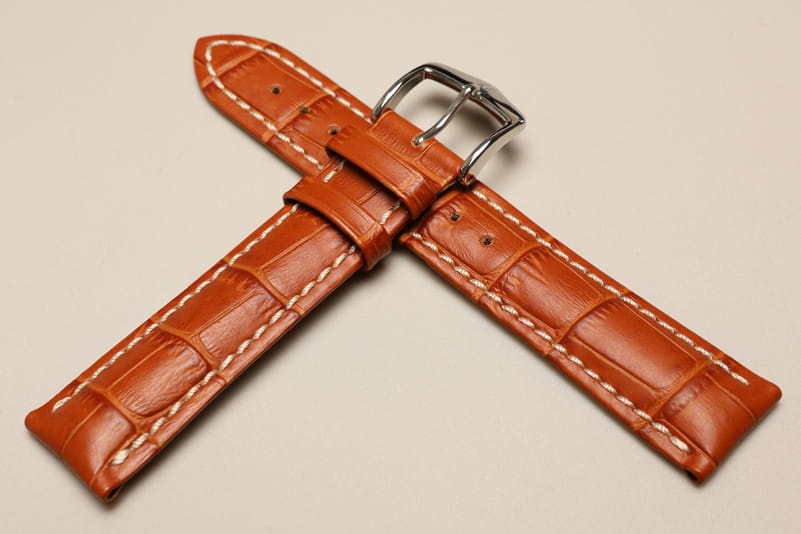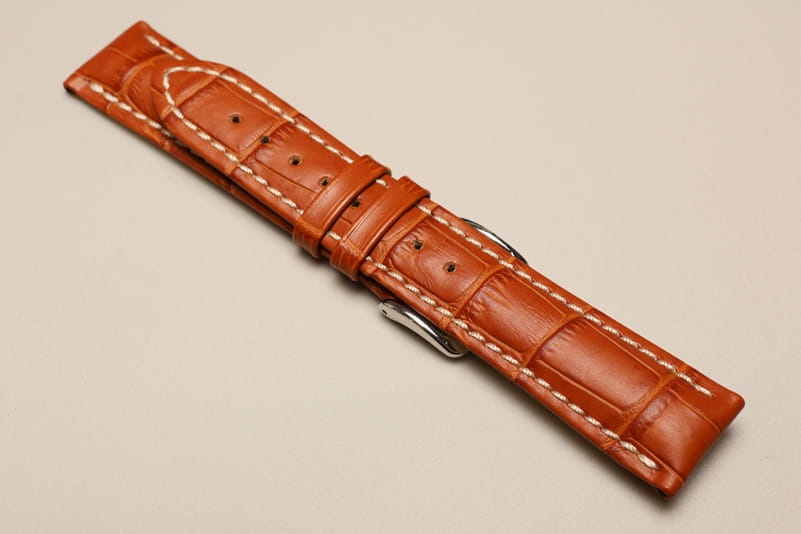 Do dużych zegarków z mocowaniem 20mm. Wykonany ze skóry cielęcej, tłoczonej na wzór skóry aligatora. Przeszywany jasną, grubą nicią. Pogrubiany przy mocowaniu do 5mm, dalej pasek cieniowany do 3mm. Podwójna szlufka, stalowa klamerka.