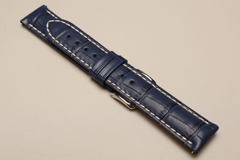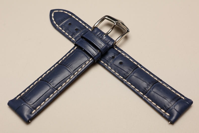 Do dużych zegarków z mocowaniem 18mm. Wykonany ze skóry cielęcej, tłoczonej na wzór skóry aligatora. Przeszywany jasną, grubą nicią. Pogrubiany przy mocowaniu do 5mm, dalej pasek cieniowany do 3mm. Podwójna szlufka, stalowa klamerka.