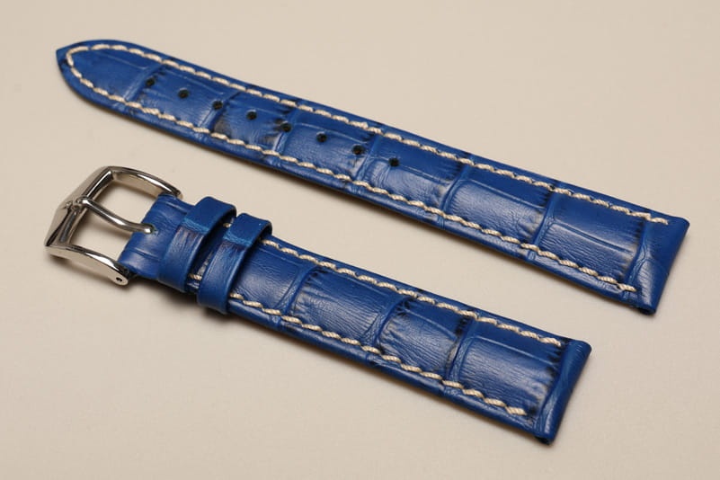 Do dużych zegarków z mocowaniem 18mm. Wykonany ze skóry cielęcej, tłoczonej na wzór skóry aligatora. Przeszywany jasną, grubą nicią. Pogrubiany przy mocowaniu do 5mm, dalej pasek cieniowany do 3mm. Podwójna szlufka, stalowa klamerka.