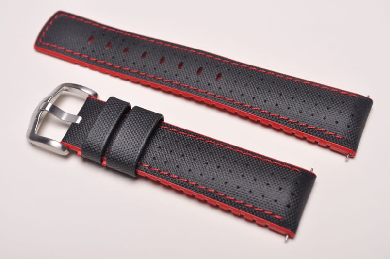 Pasek o sportowym charakterze. Wykonany z materiału o wyglądzie płótna żaglowego. Futrówka z miękkiego kauczuku Hirsch Premium. Przeszywany czerwoną nicią. Pogrubiany przy mocowaniu do 6mm, dalej pasek cieniowany do 3,2mm. Podwójna szlufka, stalowa, satynowa klamerka. Wbudowane szybkie teleskopy do łatwej zmiany.