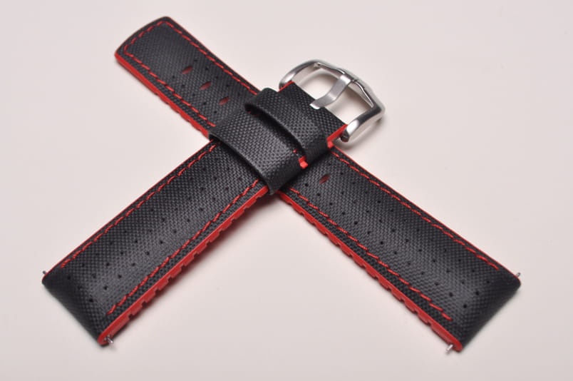 Pasek o sportowym charakterze. Wykonany z materiału o wyglądzie płótna żaglowego. Futrówka z miękkiego kauczuku Hirsch Premium. Przeszywany czerwoną nicią. Pogrubiany przy mocowaniu do 6mm, dalej pasek cieniowany do 3,2mm. Podwójna szlufka, stalowa, satynowa klamerka. Wbudowane szybkie teleskopy do łatwej zmiany.