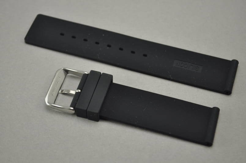 Wykonany z miękkiego, czarnego silikonu. Matowy, gładki, wyjątkowo cienki. Równoległy fason. Stalowa klamerka, podwójna szlufka. Pasuje do większości zegarków z mocowaniem 20mm.