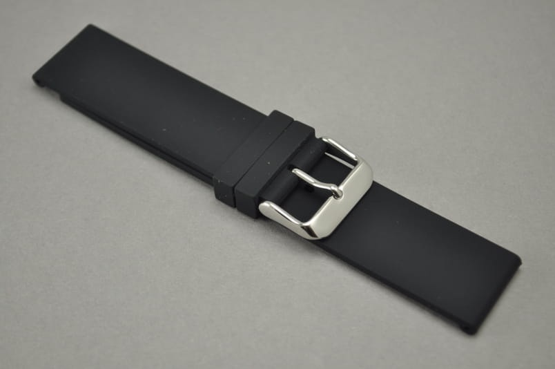Wykonany z miękkiego, czarnego silikonu. Matowy, gładki, wyjątkowo cienki. Równoległy fason. Stalowa klamerka, podwójna szlufka. Pasuje do większości zegarków z mocowaniem 24mm.