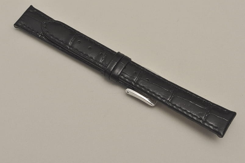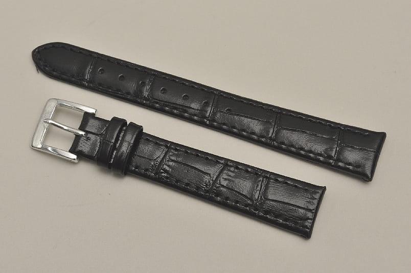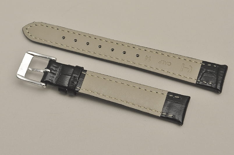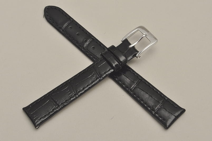 Pasek do zegarków z mocowaniem 14mm. Wykonany ze skóry naturalnej, lakierowany, wzór skóry aligatora. Cienki, od 3,0mm do 2,7mm grubości. Przeszywany nicią w kolorze paska. Podwójna szlufka, aluminiowa klamerka, gładki, skórzany spód.