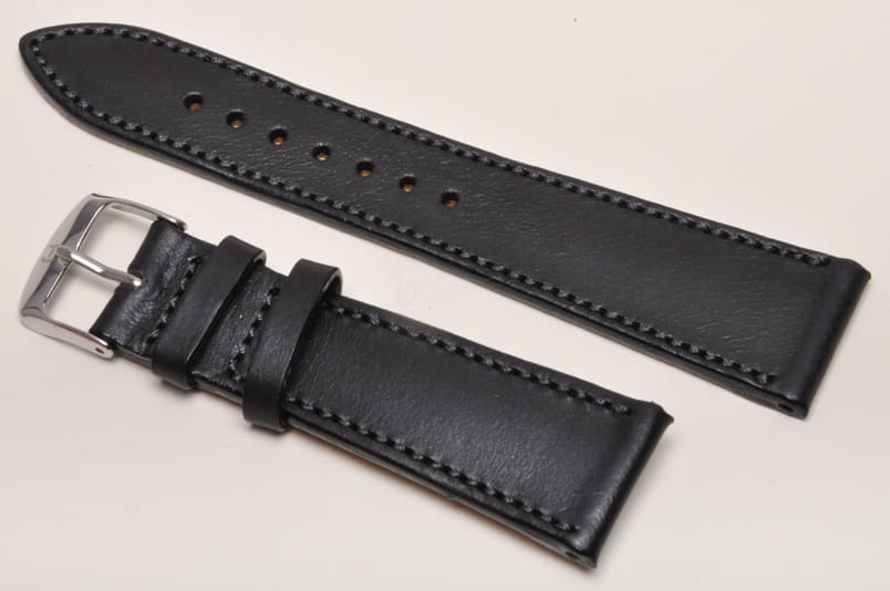 Wierzch paska wykonany z naturalnej skóry cielęcej, mocno woskowanej. Wykończenie na półpołysk. Futrówka z delikatnej w dotyku, najwyższej jakości skóry używanej przez uznanych producentów m.in. Hermes. Płaski i miękki. Pasek przeszyty nicią pod kolor. Dwie szlufki, metalowa klamerka. Mocno przewężany, elegancki pasek do cienkich oraz mniej typowych zegarków, nadający im klasyczny charakter.