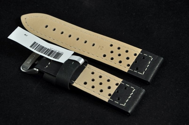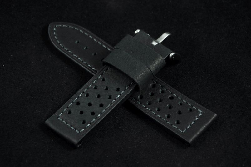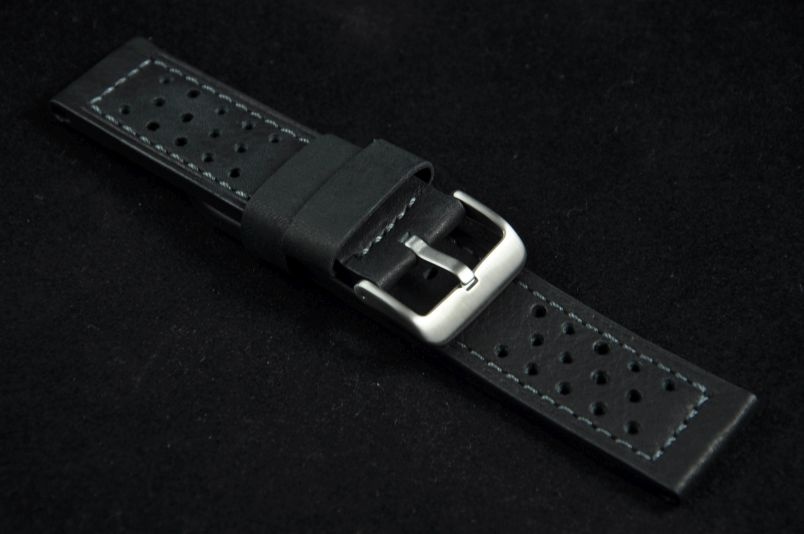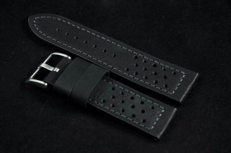 Do dużych zegarków z mocowaniem 24mm. Wykonany ze skóry naturalnej. Przeszywany nicią w kolorze paska. Gruby i masywny, 5mm grubości. Miękki, ładnie układa się na ręku. Perforowany typu tropic przy mocowaniu. Matowy. Podwójna szlufka, stalowa klamerka.