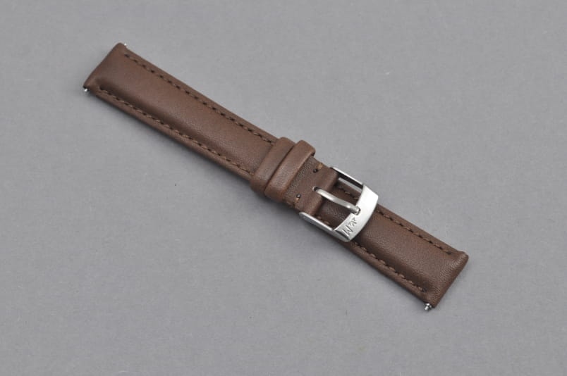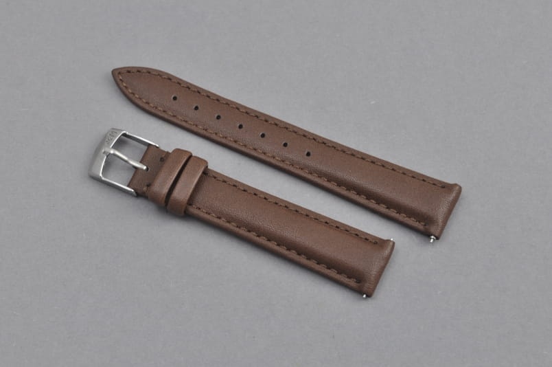 Pasek wykonany w 100% ze skóry syntetycznej, gładki, przeszyty nicią w kolorze paska. Lekko pogrubiany. Podwójna szlufka, stalowa klamerka. W komplecie szybkie teleskopy do łatwej zmiany.