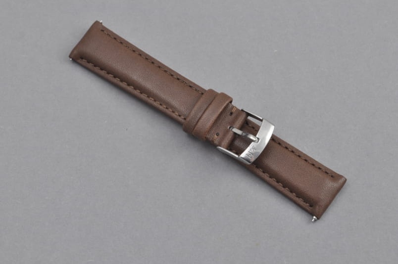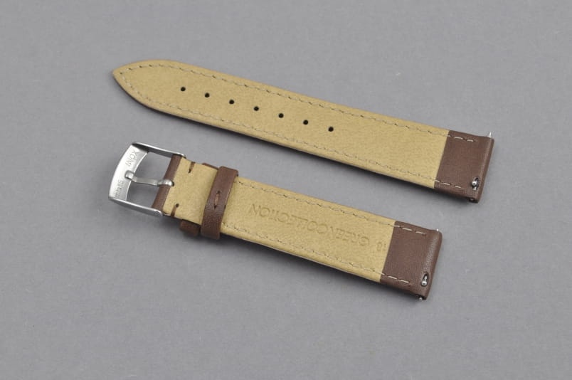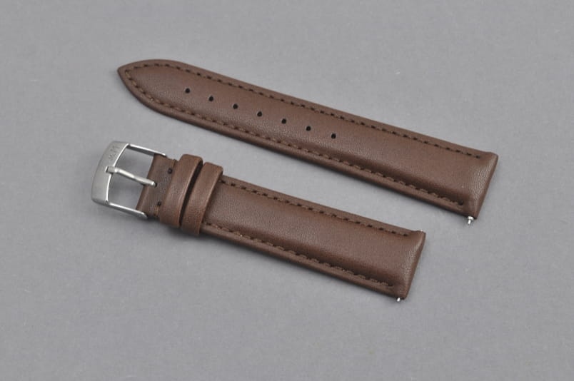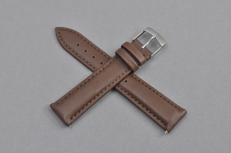 Pasek wykonany w 100% ze skóry syntetycznej, gładki, przeszyty nicią w kolorze paska. Lekko pogrubiany. Podwójna szlufka, stalowa klamerka. W komplecie szybkie teleskopy do łatwej zmiany.