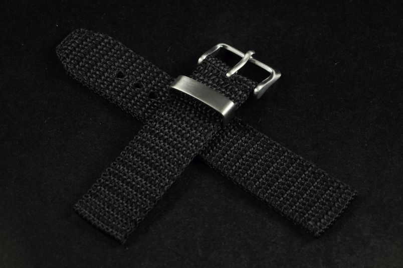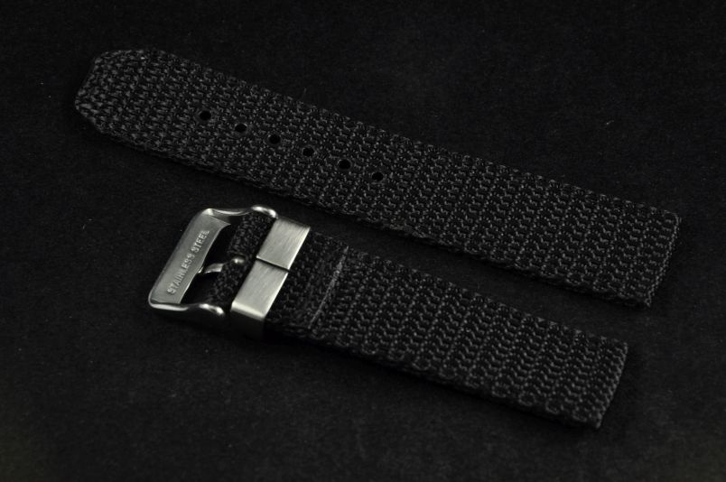 Pasek do zegarka typu Nato, dwuczęściowy. Wykonany z nylonowego materiału, szyty nicią w kolorze paska. Stalowa, ruchoma szlufka, stalowa klamerka mocowana na teleskop.