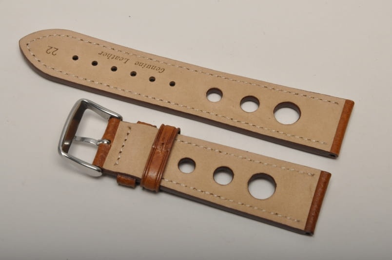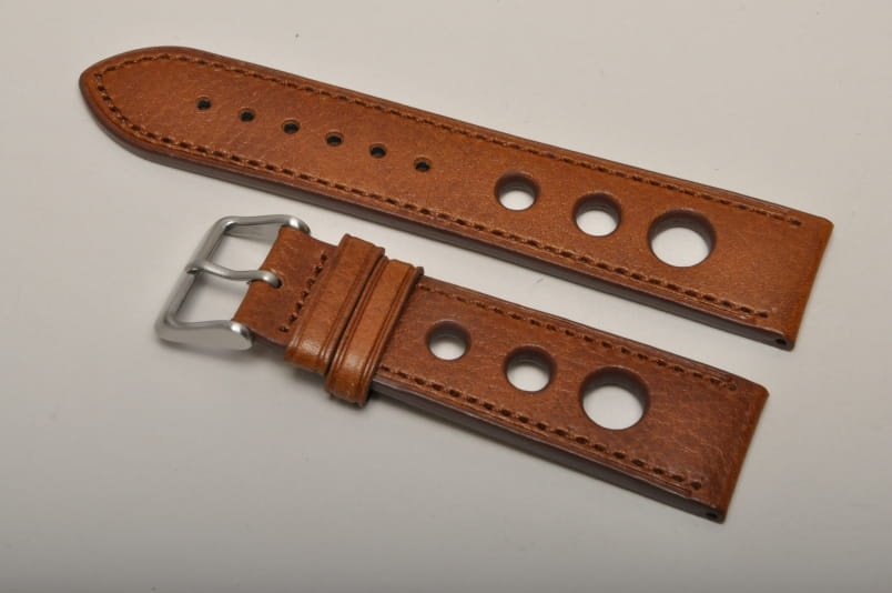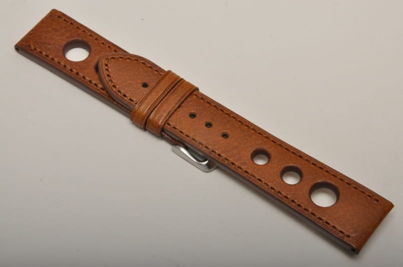 Skórzany pasek typu Rally o delikatnej fakturze byczej skóry. Charakterystyczne 3 wycięcia w pasku. Przeszycie w kolorze paska. Podwójna szlufka, stalowa klamerka. Pasek jednolitej grubości na całej długości - ok. 3,7mm. Pasek nadający typowo sportowy charakter niemal każdemu zegarkowi.