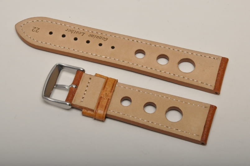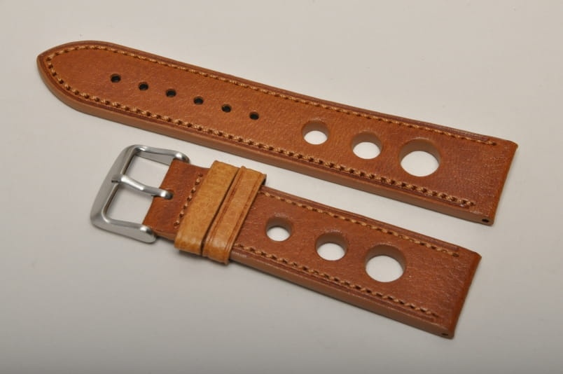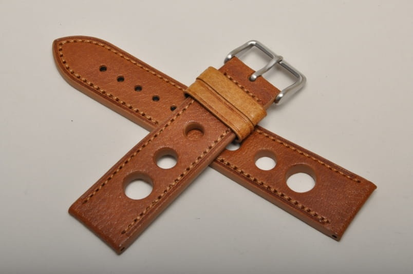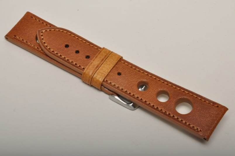 Skórzany pasek typu Rally o delikatnej fakturze byczej skóry. Charakterystyczne 3 wycięcia w pasku. Przeszycie w kolorze jasnobrązowym. Podwójna szlufka, stalowa klamerka. Pasek jednolitej grubości na całej długości - ok. 3,7mm. Pasek nadający typowo sportowy charakter niemal każdemu zegarkowi.
