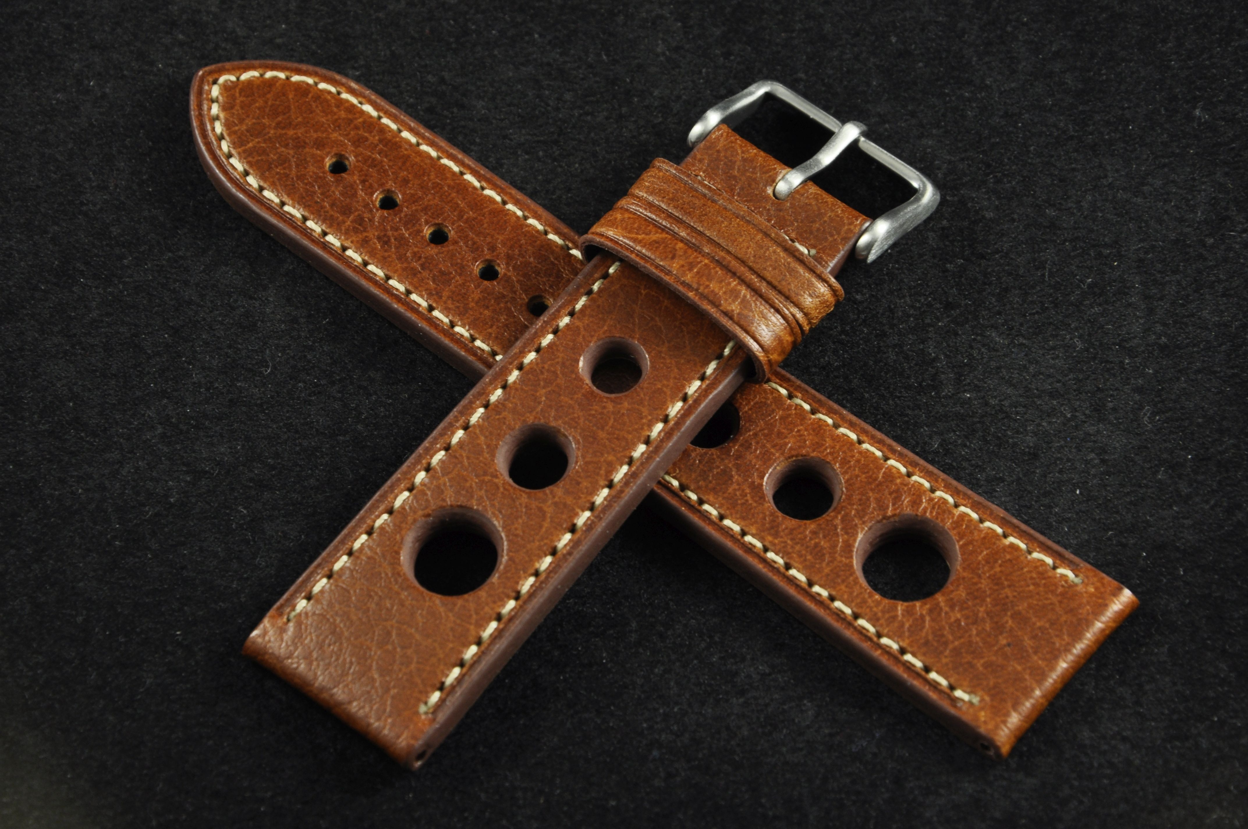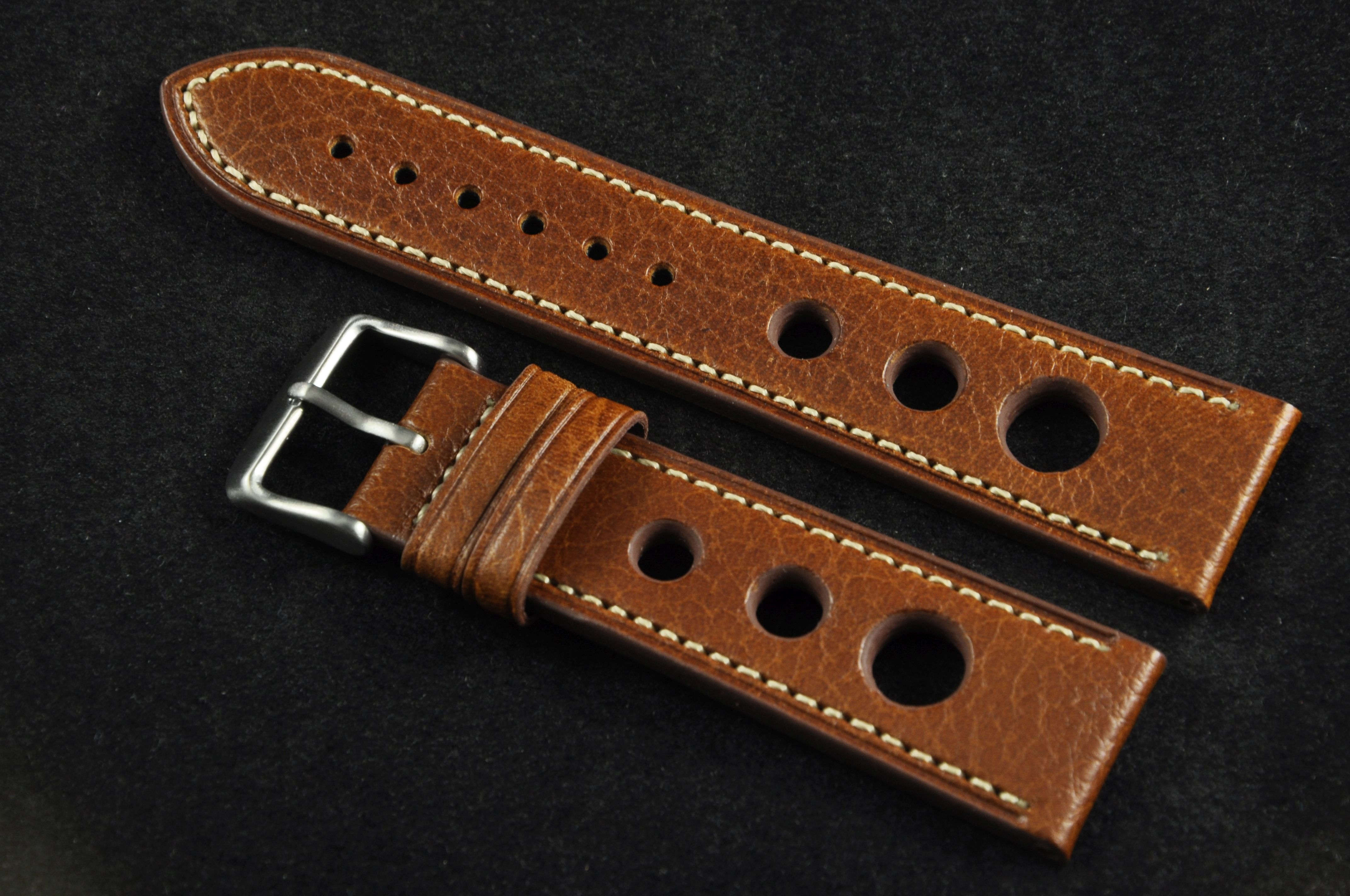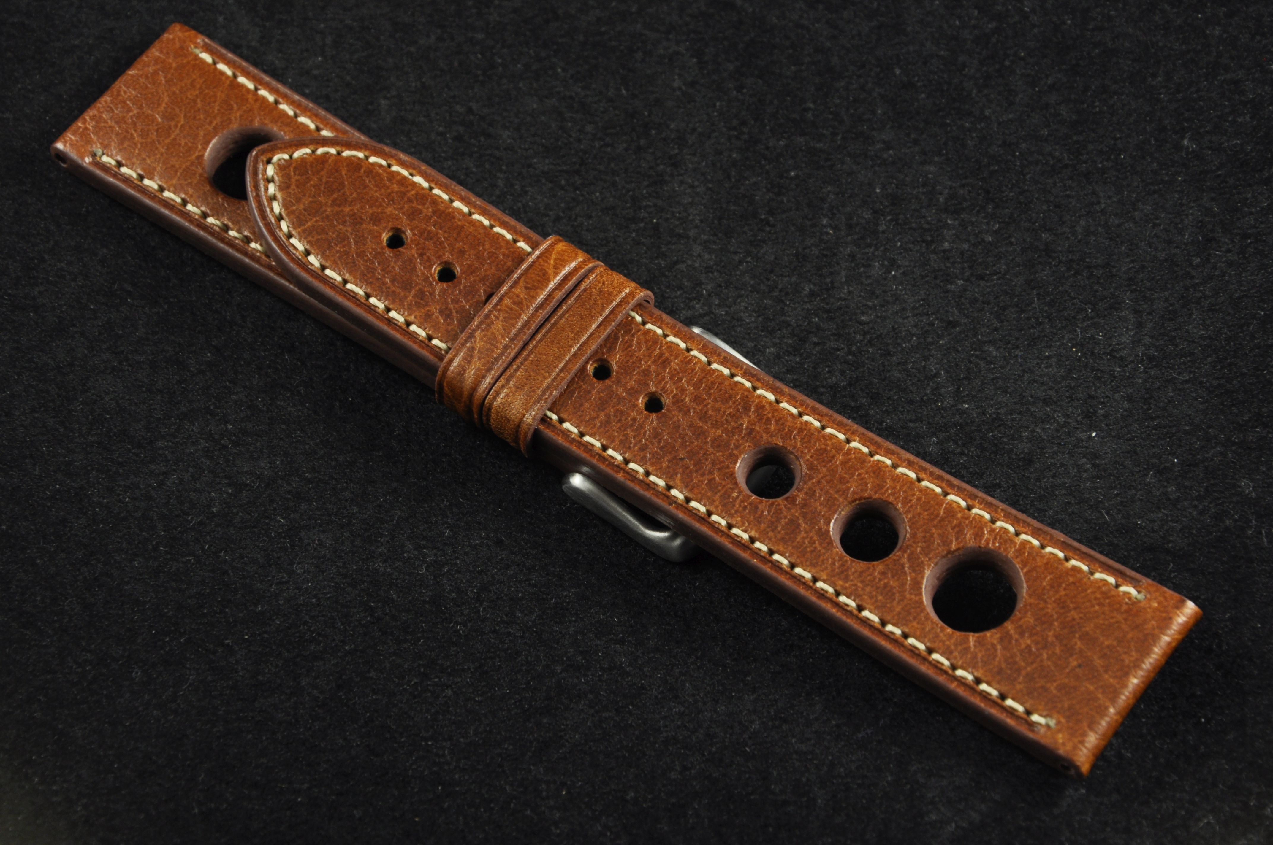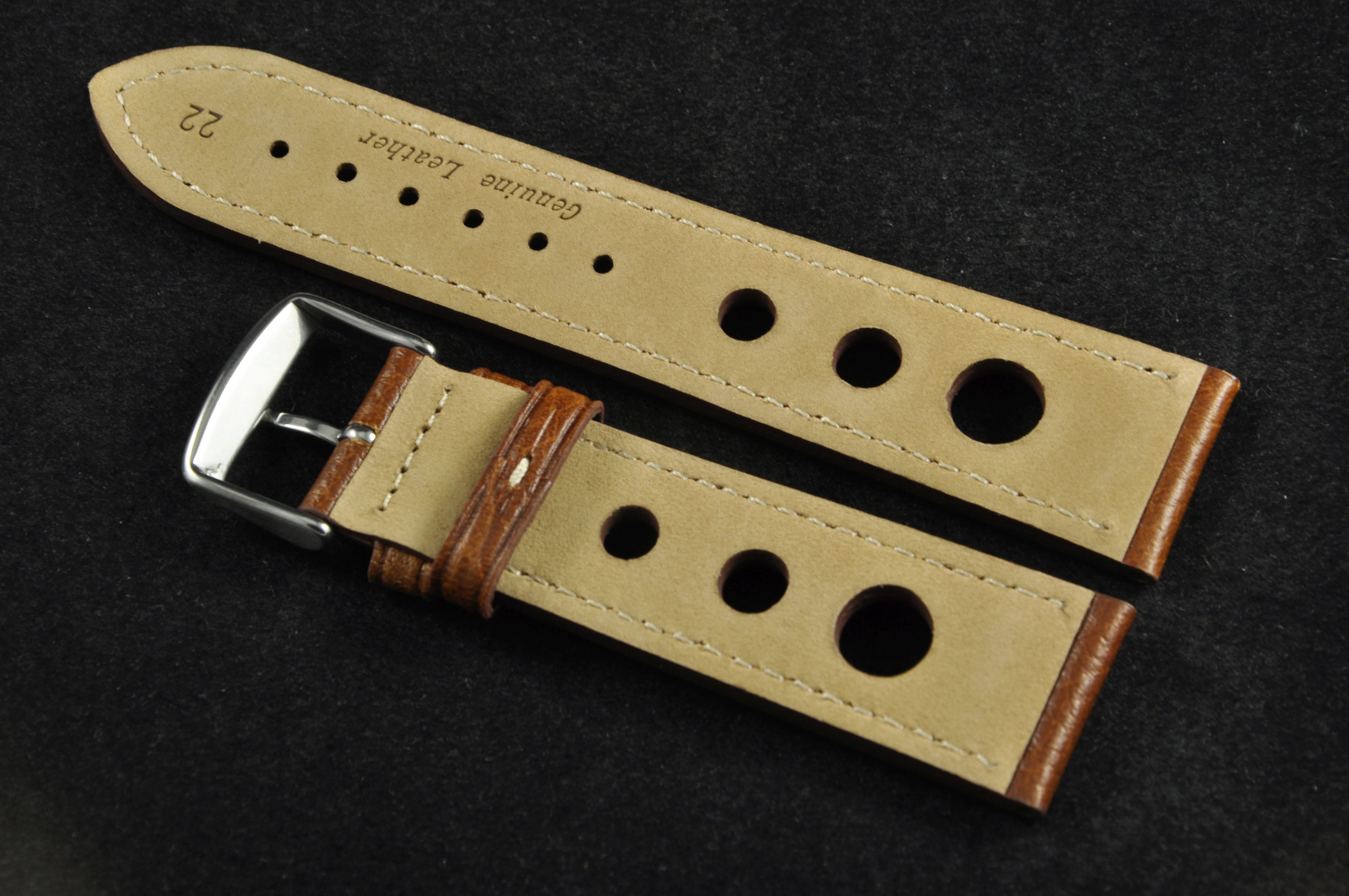 Skórzany pasek typu Rally o delikatnej fakturze byczej skóry. Charakterystyczne 3 wycięcia w pasku. Przyszycie w kolorze białym. Podwójna szlufka, stalowa klamerka. Pasek jednolitej grubości na całej długości - ok. 3,7mm. Pasek nadający typowo sportowy charakter niemal każdemu zegarkowi.