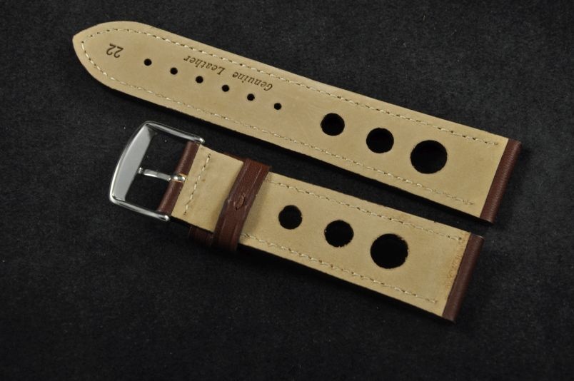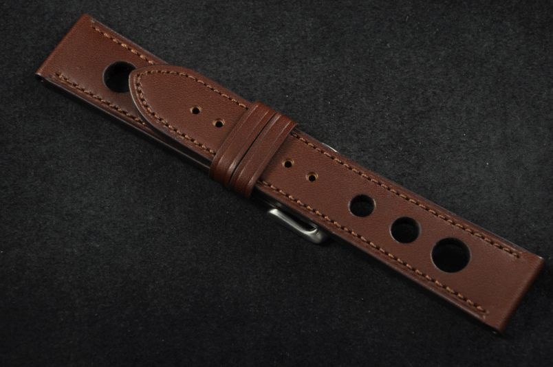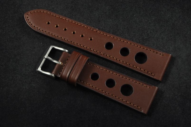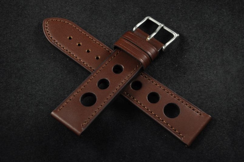 Skórzany pasek typu Rally. Charakterystyczne 3 wycięcia w pasku. Przyszycie w kolorze paska. Podwójna szlufka, stalowa klamerka. Pasek jednolitej grubości na całej długości - ok. 3,7mm. Pasek nadający typowo sportowy charakter niemal każdemu zegarkowi.