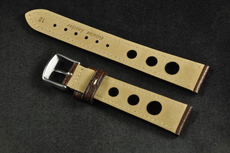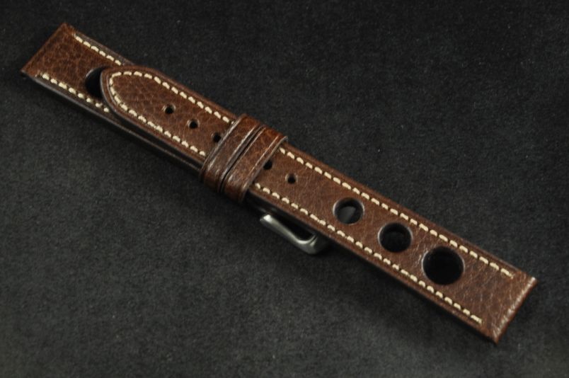 Skórzany pasek typu Rally o delikatnej fakturze byczej skóry. Charakterystyczne 3 wycięcia w pasku. Przyszycie w kolorze białym. Podwójna szlufka, stalowa klamerka. Pasek jednolitej grubości na całej długości - ok. 3,7mm. Pasek nadający typowo sportowy charakter niemal każdemu zegarkowi.