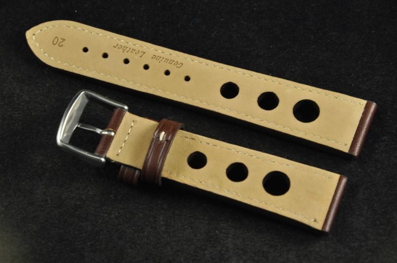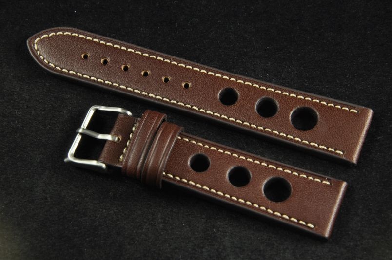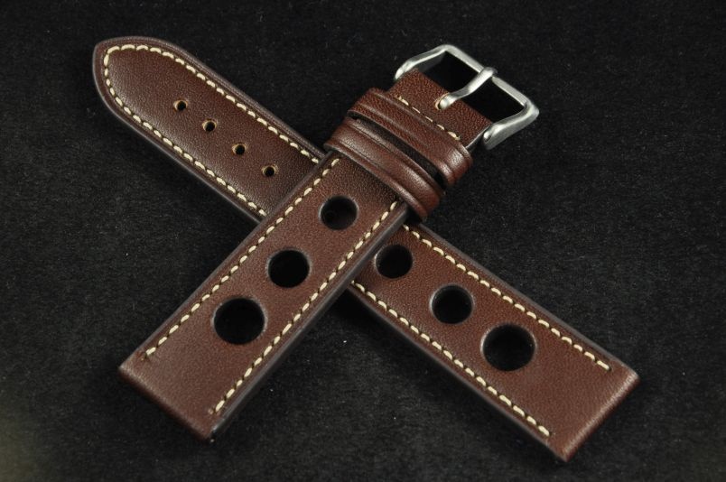 Skórzany pasek typu Rally. Charakterystyczne 3 wycięcia w pasku. Przyszycie w kolorze białym. Podwójna szlufka, stalowa klamerka. Pasek jednolitej grubości na całej długości - ok. 3,7mm. Pasek nadający typowo sportowy charakter niemal każdemu zegarkowi.