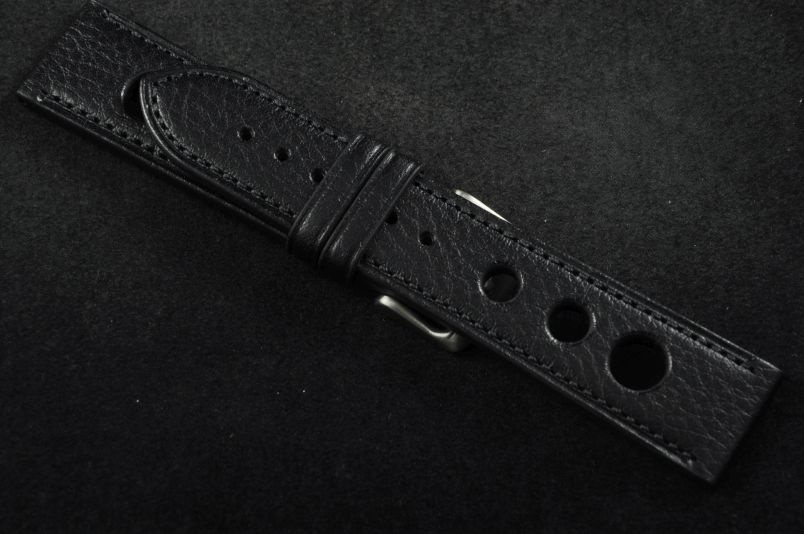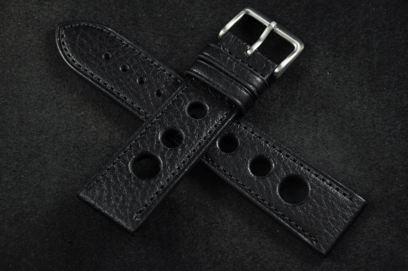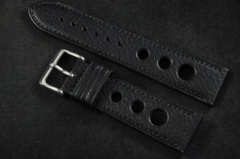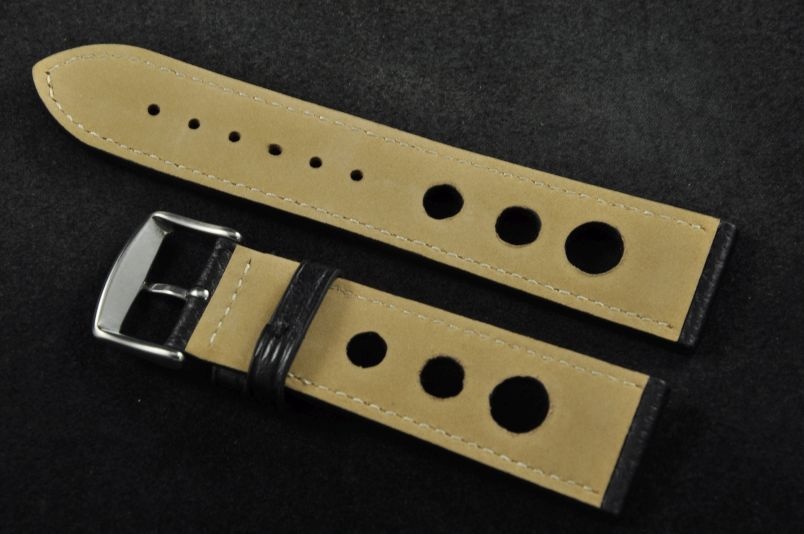 Skórzany pasek typu Rally. Charakterystyczne 3 wycięcia w pasku. Przyszycie w kolorze paska. Delikatna faktura skóry. Podwójna szlufka, stalowa klamerka. Pasek jednolitej grubości na całej długości - ok. 3,7mm. Pasek nadający typowo sportowy charakter niemal każdemu zegarkowi.