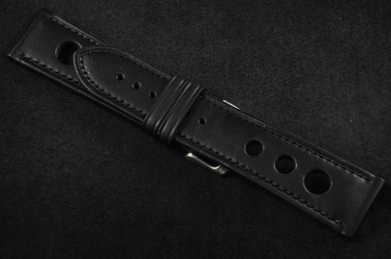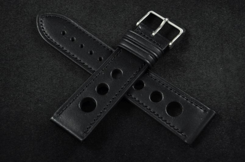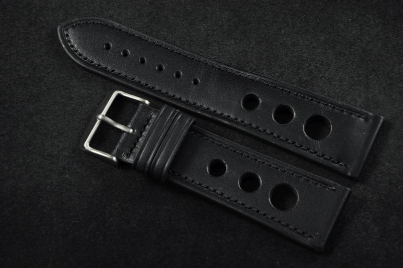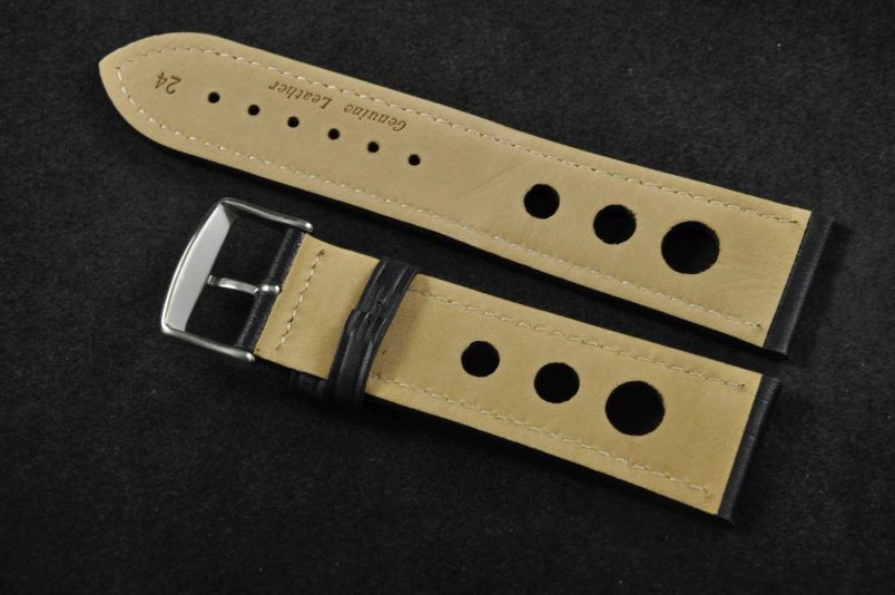 Skórzany pasek typu Rally. Charakterystyczne 3 wycięcia w pasku. Przyszycie w kolorze paska. Podwójna szlufka, stalowa klamerka. Pasek jednolitej grubości na całej długości - ok. 3,7mm. Pasek nadający typowo sportowy charakter niemal każdemu zegarkowi.