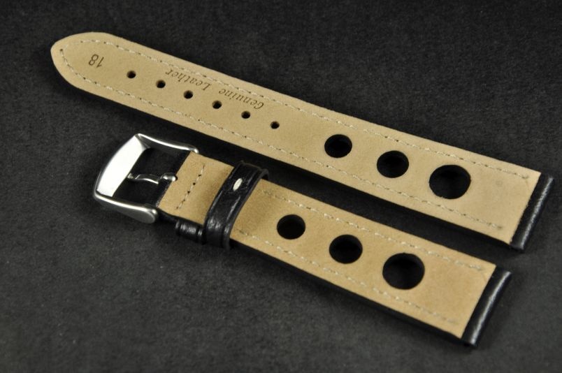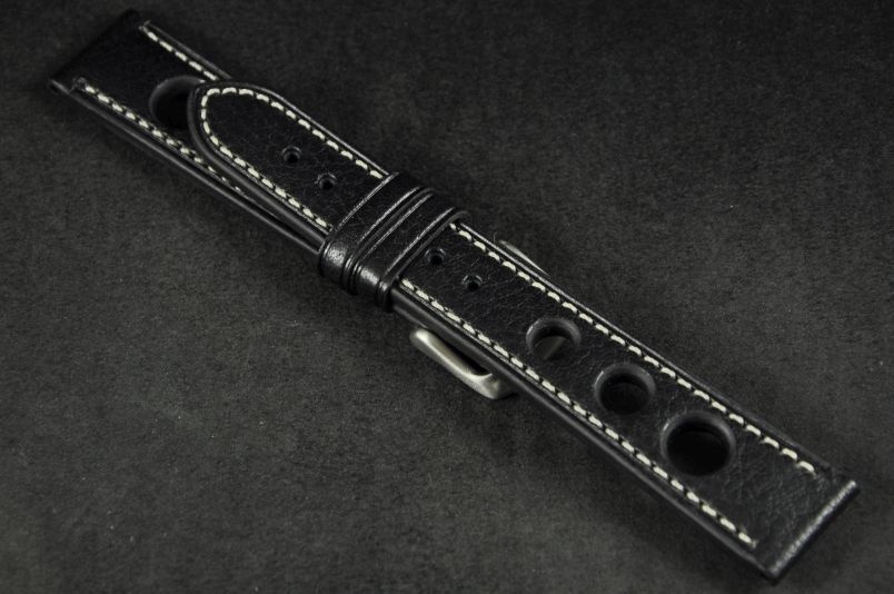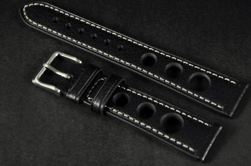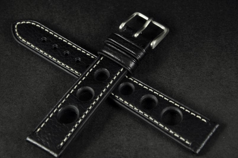 Skórzany pasek typu Rally o delikatnej fakturze byczej skóry. Charakterystyczne 3 wycięcia w pasku. Przyszycie w kolorze białym. Podwójna szlufka, stalowa klamerka. Pasek jednolitej grubości na całej długości - ok. 3,7mm. Pasek nadający typowo sportowy charakter niemal każdemu zegarkowi.