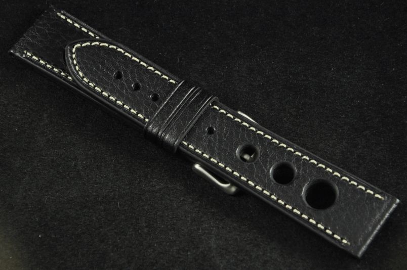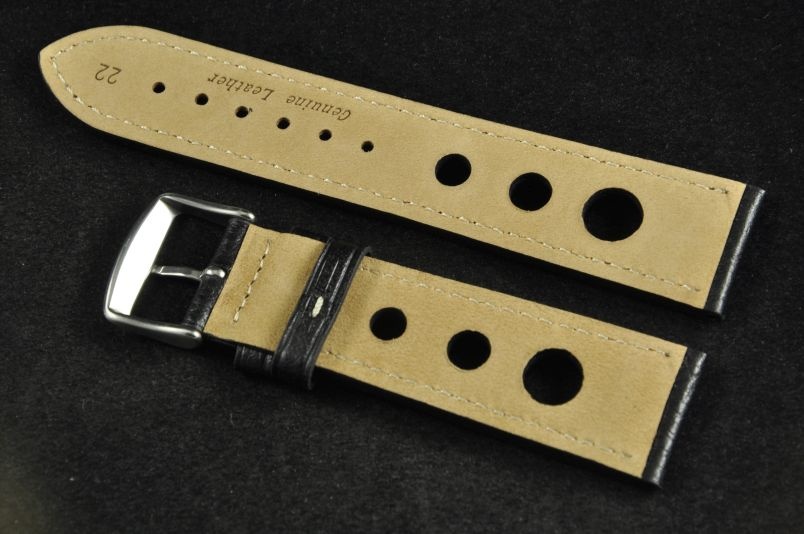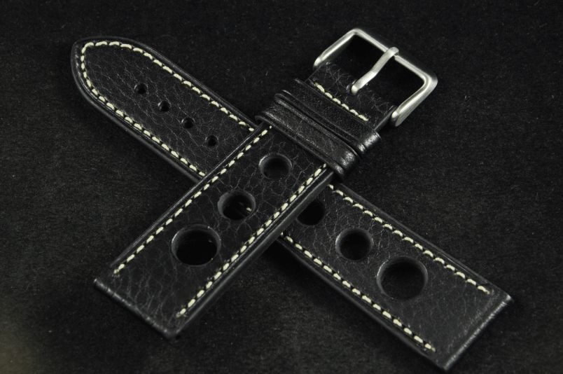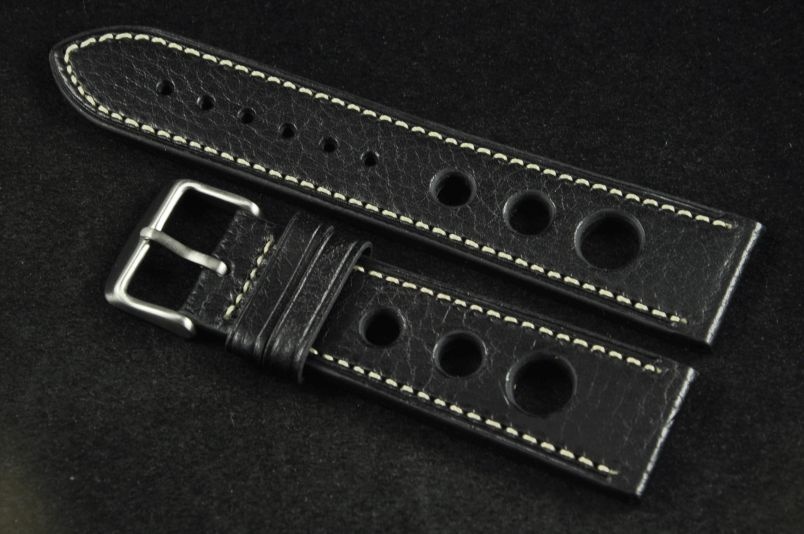 Skórzany pasek typu Rally o delikatnej fakturze byczej skóry. Charakterystyczne 3 wycięcia w pasku. Przyszycie w kolorze białym. Podwójna szlufka, stalowa klamerka. Pasek jednolitej grubości na całej długości - ok. 3,7mm. Pasek nadający typowo sportowy charakter niemal każdemu zegarkowi.