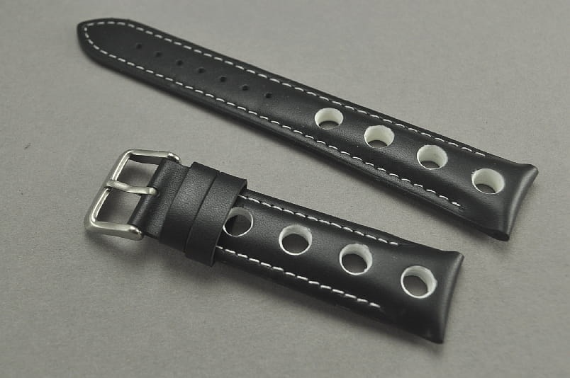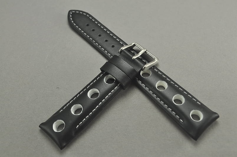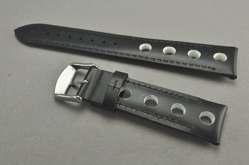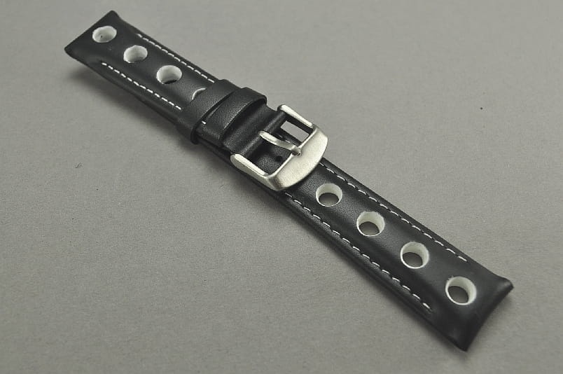 Skórzany pasek typu Rally. Charakterystyczne 4 otwory w pasku. Przeszycie w kolorze białym, podobnie jak