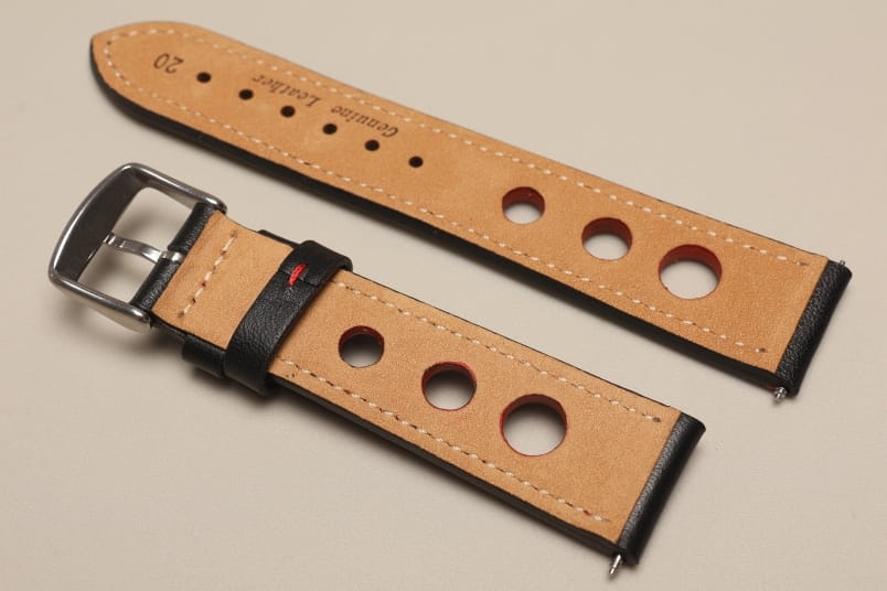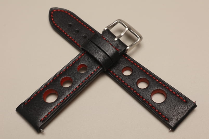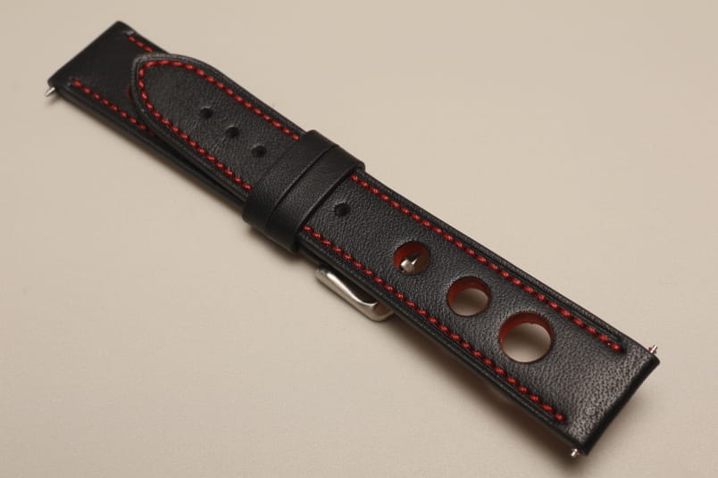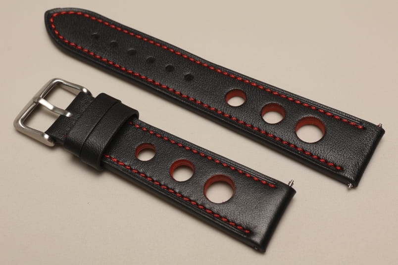 Skórzany pasek typu Rally. Charakterystyczne 3 otwory w pasku, malowane wewnątrz na czerwono. Przeszycie także w kolorze czerwonym. Podwójna szlufka, stalowa klamerka. Pasek jednolitej grubości na całej długości - ok. 3,7mm. Pasek nadający typowo sportowy charakter niemal każdemu zegarkowi.