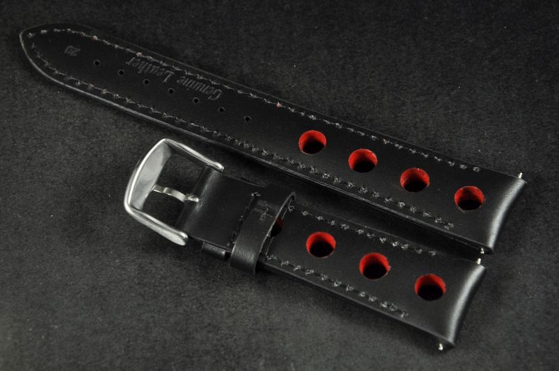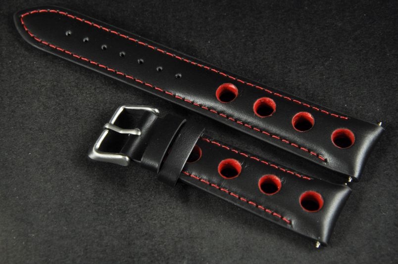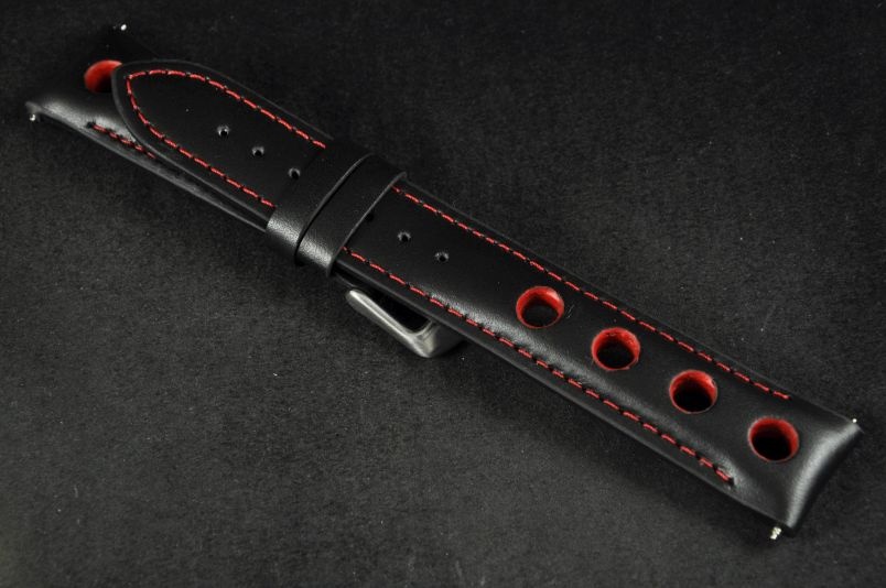 Skórzany pasek typu Rally. Charakterystyczne 4 wycięcia w pasku. Przeszycie w kolorze czerwonym.