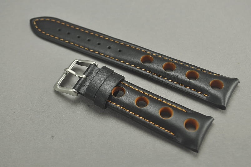 Skórzany pasek typu Rally. Charakterystyczne 4 otwory w pasku. Przeszycie w kolorze pomarańczowym, podobnie jak