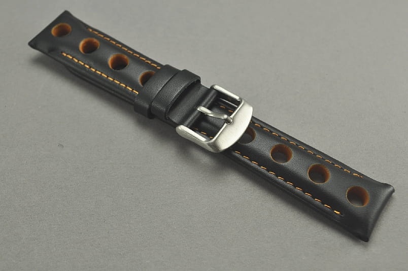 Pasek Rally Skórzany, Czarny, Pomarańczowe dziurki i nić, 24mm