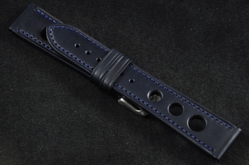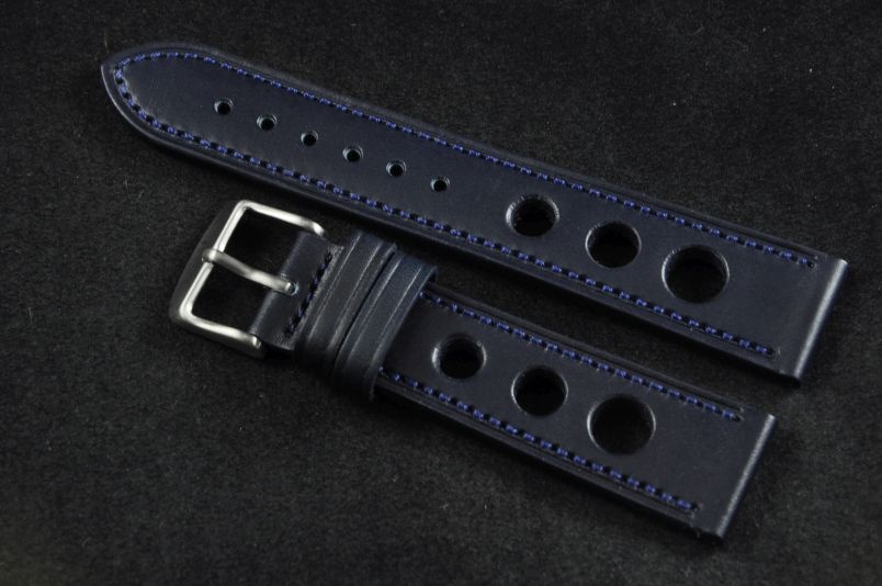Skórzany pasek typu Rally. Charakterystyczne 3 wycięcia w pasku. Przyszycie w kolorze niebieskim. Podwójna szlufka, stalowa klamerka. Pasek jednolitej grubości na całej długości - ok. 3,7mm. Pasek nadający typowo sportowy charakter niemal każdemu zegarkowi.
