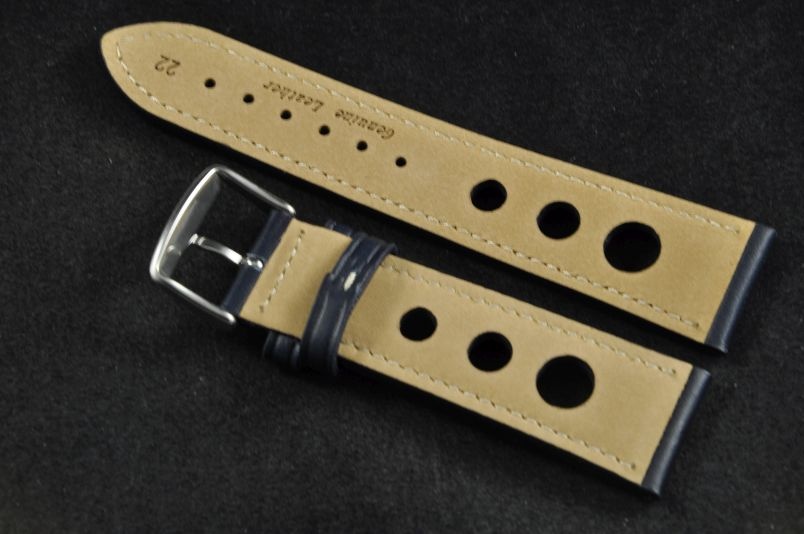 Skórzany pasek typu Rally. Charakterystyczne 3 otwory w pasku. Przyszycie w kolorze białym. Podwójna szlufka, stalowa klamerka. Pasek jednolitej grubości na całej długości - ok. 3,7mm. Pasek nadający typowo sportowy charakter niemal każdemu zegarkowi.