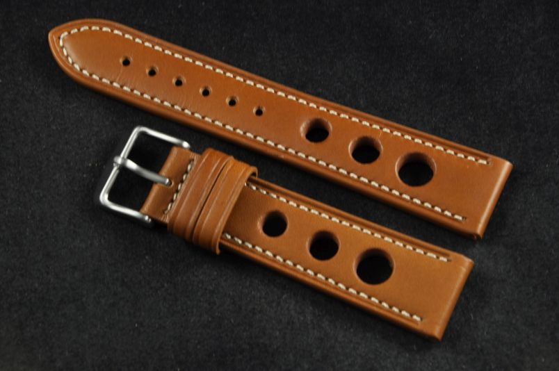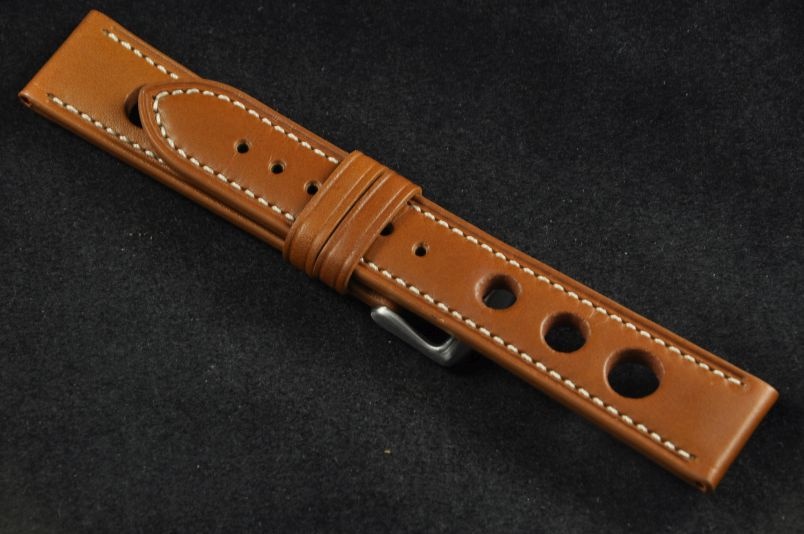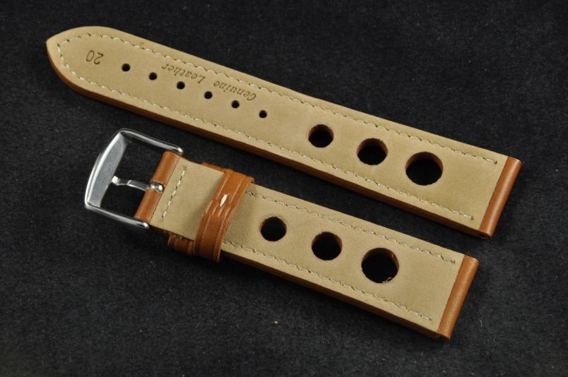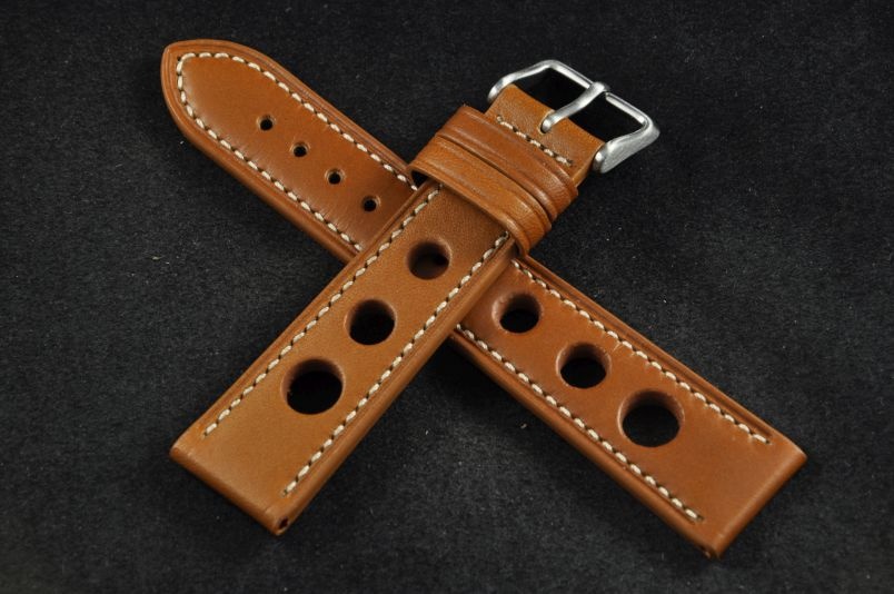 Skórzany pasek typu Rally. Charakterystyczne 3 wycięcia w pasku. Przyszycie w kolorze białym. Podwójna szlufka, stalowa klamerka. Pasek jednolitej grubości na całej długości - ok. 3,7mm. Pasek nadający typowo sportowy charakter niemal każdemu zegarkowi.