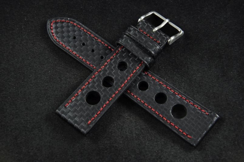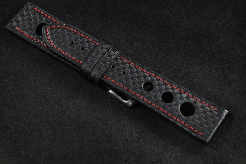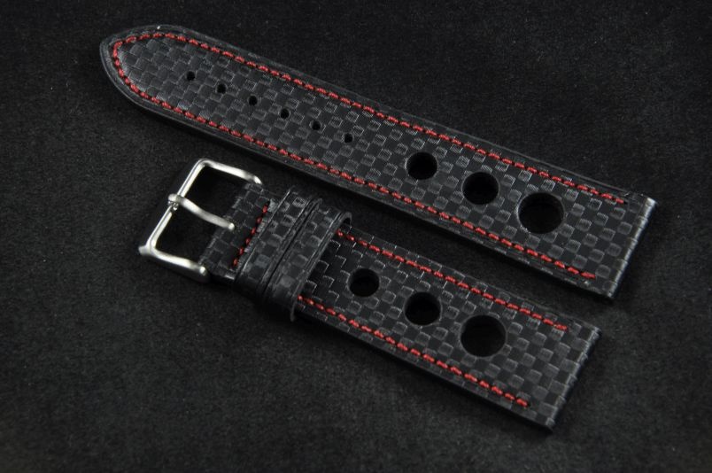 Skórzany pasek typu Rally z tłoczonym wzorem włókna węglowego. Charakterystyczne 3 wycięcia w pasku. Przyszycie w kolorze czerwonym. Podwójna szlufka, stalowa klamerka. Pasek jednolitej grubości na całej długości - ok. 3,7mm. Pasek nadający typowo sportowy charakter niemal każdemu zegarkowi.