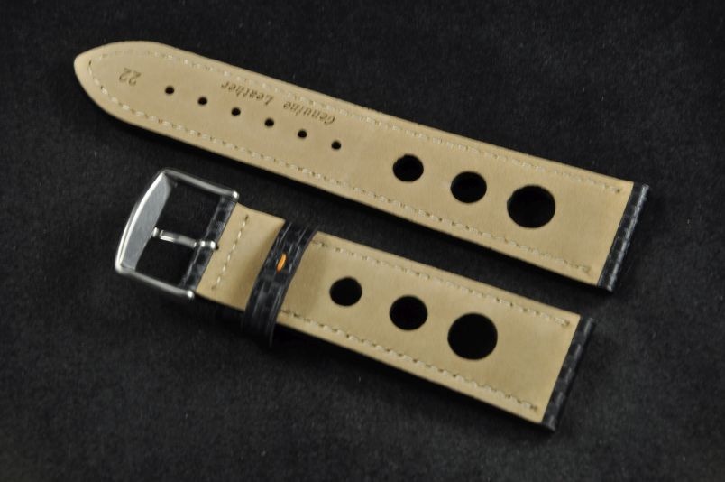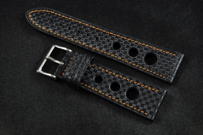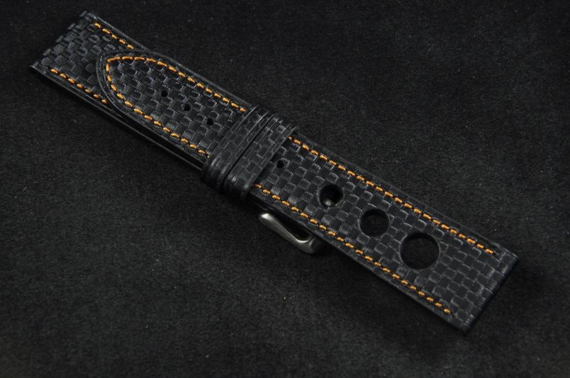Skórzany pasek typu Rally z tłoczonym wzorem włókna węglowego. Charakterystyczne 3 wycięcia w pasku. Przyszycie w kolorze pomarańczowym. Podwójna szlufka, stalowa klamerka. Pasek jednolitej grubości na całej długości - ok. 3,7mm. Pasek nadający typowo sportowy charakter niemal każdemu zegarkowi.