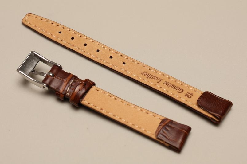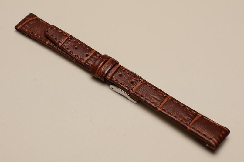 Grubość paska przy mocowaniu 4,5mm.Wykonany ze skóry cielęcej, ze wzorem skóry aligatora. Przeszyty nicą w kolorze paska. Podwójna szlufka, stalowa klamerka. Do wiekowych oraz złotych zegarków.