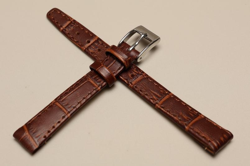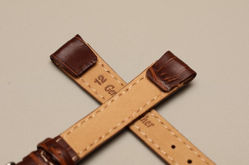 Grubość paska przy mocowaniu 4,5mm.Wykonany ze skóry cielęcej, ze wzorem skóry aligatora. Przeszyty nicą w kolorze paska. Podwójna szlufka, stalowa klamerka. Do wiekowych oraz złotych zegarków.