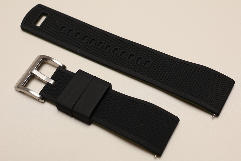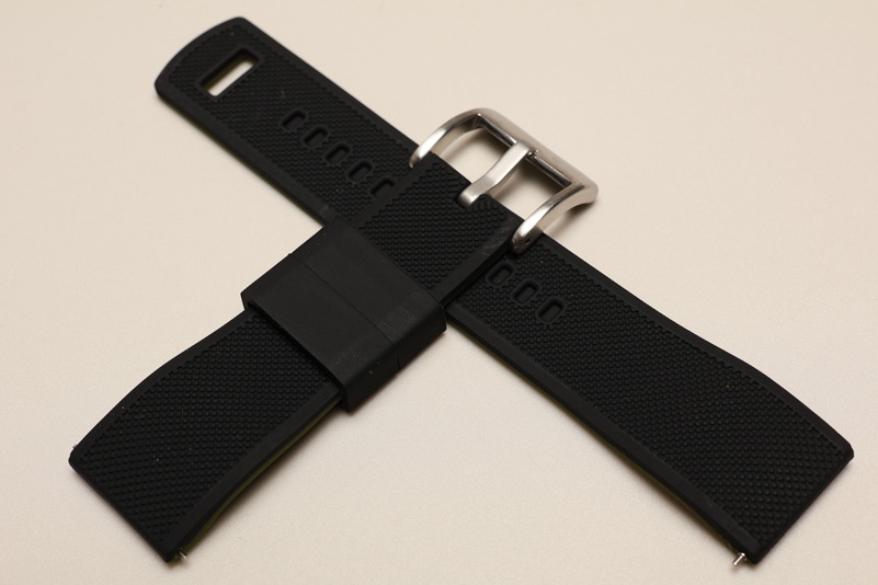 Silikonowy, elastyczny, miękki, dwukolorowy pasek. Wierzch w kolorze czarnym z widocznym wzorem drobnej kratki, od spodu zielony, gładki.