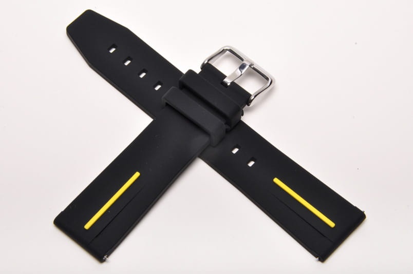 Wykonany z miękkiego silikonu, w jednolitym kolorze. Gładki, na obu częściach paska pogubienie układające się na kształt litery T. Na niej lekko wypukła, ozdobna kreska w kolorze żółtym. Dwie ruchome szlufki, stalowa, polerowana klamerka. Wbudowane teleskopy do szybkiego montażu.