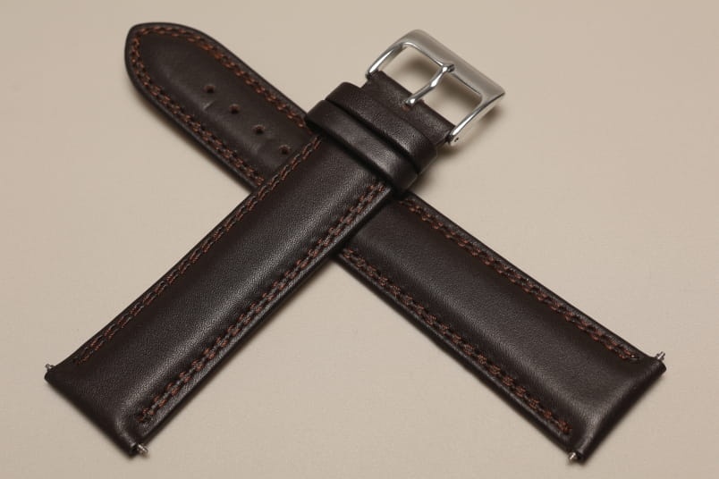 Pasek do zegarków wykonany ze skóry cielęcej, gładki, półmatowy. Przeszywany podwójnie nicią pod kolor, spód ze skóry licowej. Cienki (4,00mm) i elegancki, dość miękki pasek, . Podwójna szlufka, stalowa klamerka. Dłuższa wersja XL.