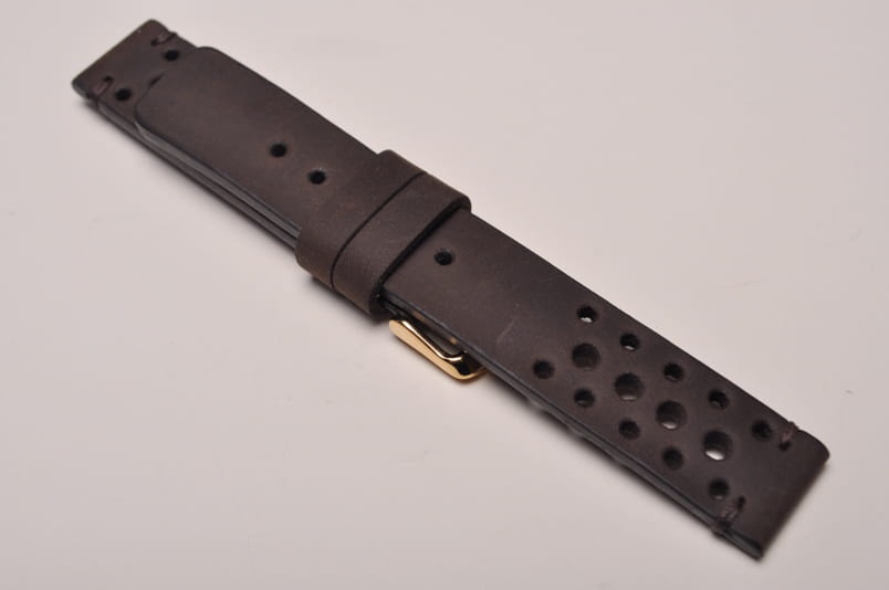Pasek w stylu vintage z jednego kawałka skóry, klejony, gładki. Miękki, wykończenie matowe. Charakterystyczne dla modelu Tropic otwory w pasku, cztery większe otwory przez środek, po bokach symetrycznie po pięć mniejszych. Fason równoległy, koniec paska równo ścięty. Dwie ruchome szlufki, stalowa klamerka. Na końcach paska i przy klamerce ozdobne przeszycia pod kolor.