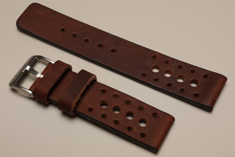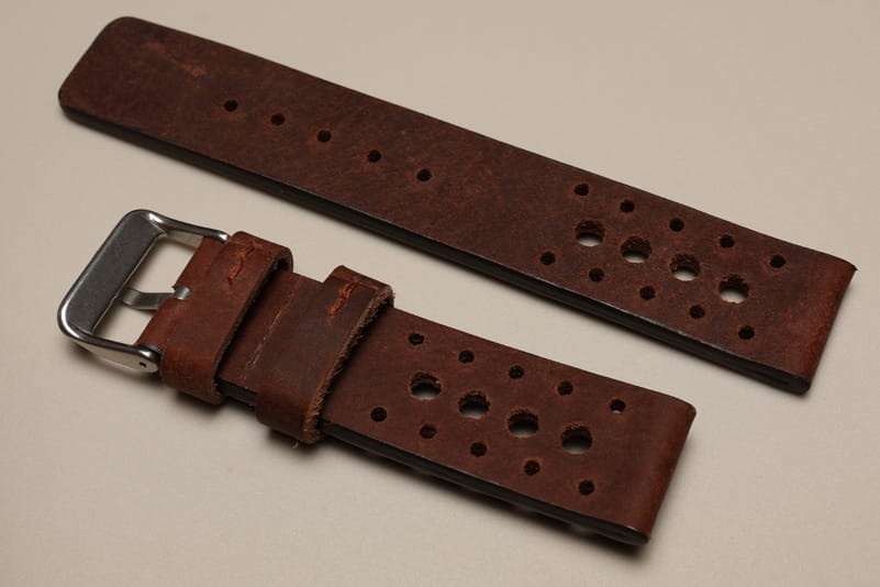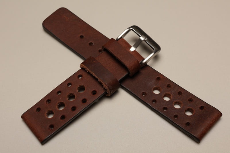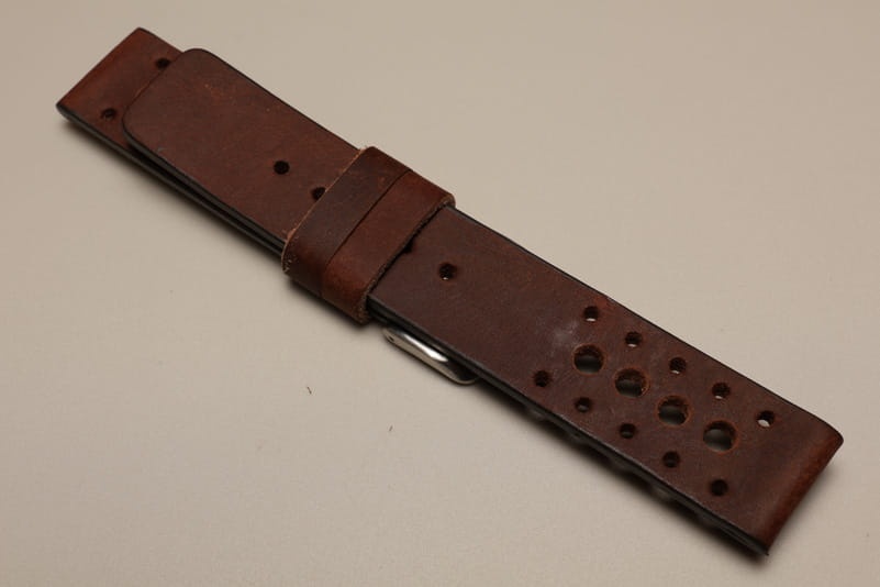 Pasek w stylu vintage z jednego kawałka skóry, klejony, gładki. Miękki, wykończenie matowe. Charakterystyczne dla modelu Tropic otwory w pasku. Fason równoległy, koniec paska równo ścięty. Dwie ruchome szlufki, stalowa klamerka.